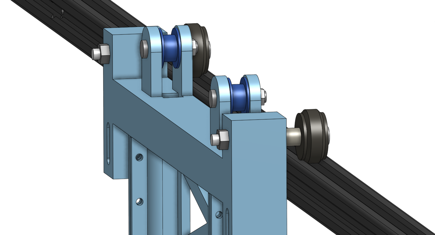 For the horizontal X-axis, which spans a significant length, I needed an even more budget-friendly yet effective solution. Drawing inspiration from entry-level 3D printers like the Ender 3, I chose 20mm x 20mm V-slot aluminium extrusions paired with matching rubber wheels that fit precisely into the V-slot profile. These components are readily available as off-the-shelf replacement parts for 3D printers, making them both cost-effective and easy to source. The wheels come as complete assemblies with pre-mounted bearings, screws, and spacers, simplifying integration into the gantry design.