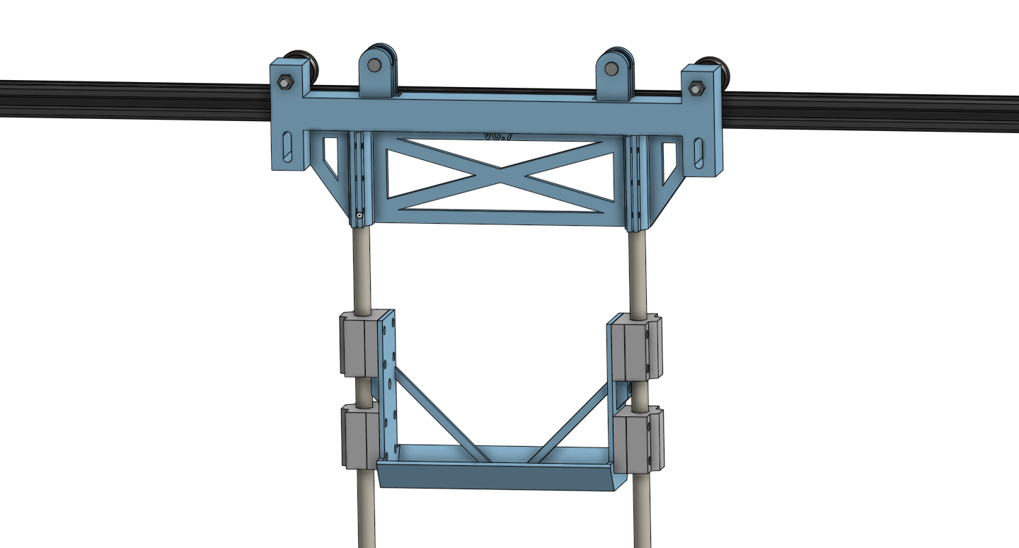 Beyond load-bearing considerations, the gantry must be exceptionally rigid, particularly against torsion and racking forces, which could cause misalignment. To address this, I designed it with a wide stance and rigid diagonal supports, improving structural integrity. The stainless steel rods of the vertical Y-axis are securely mounted at the gantry ends using press fittings, which are tensioned with small screws to ensure a stable connection. This setup enhances overall rigidity and minimizes flex during rapid movements.